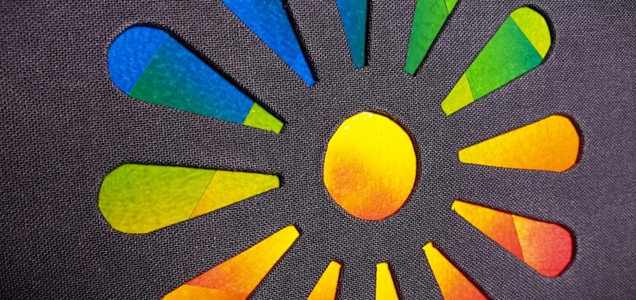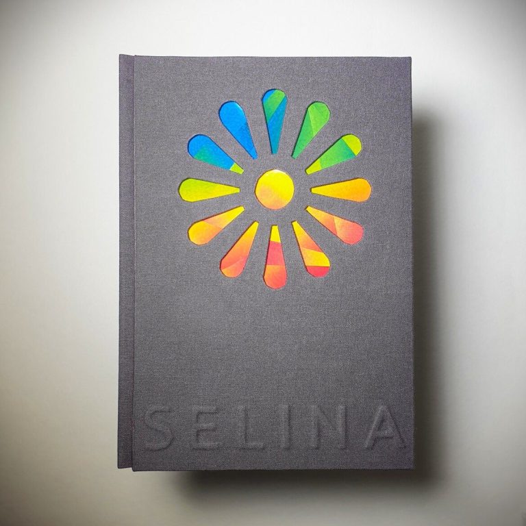 Inspiration durch die Buntglasfenster der Sagrada Familia. Personalisiert durch erhabenen Namenszug unter dem Leinenbezug.