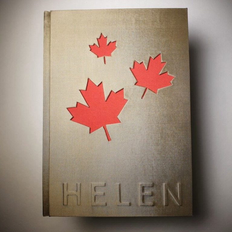 Passepartout-Ausschnitte in Form von Ahornblatt-Motiven. Darunter liegende zweite Ebene in kontrastierendem Buchleinen. Personalisiert durch erhabenen Namenszug unter dem Buchleinen.